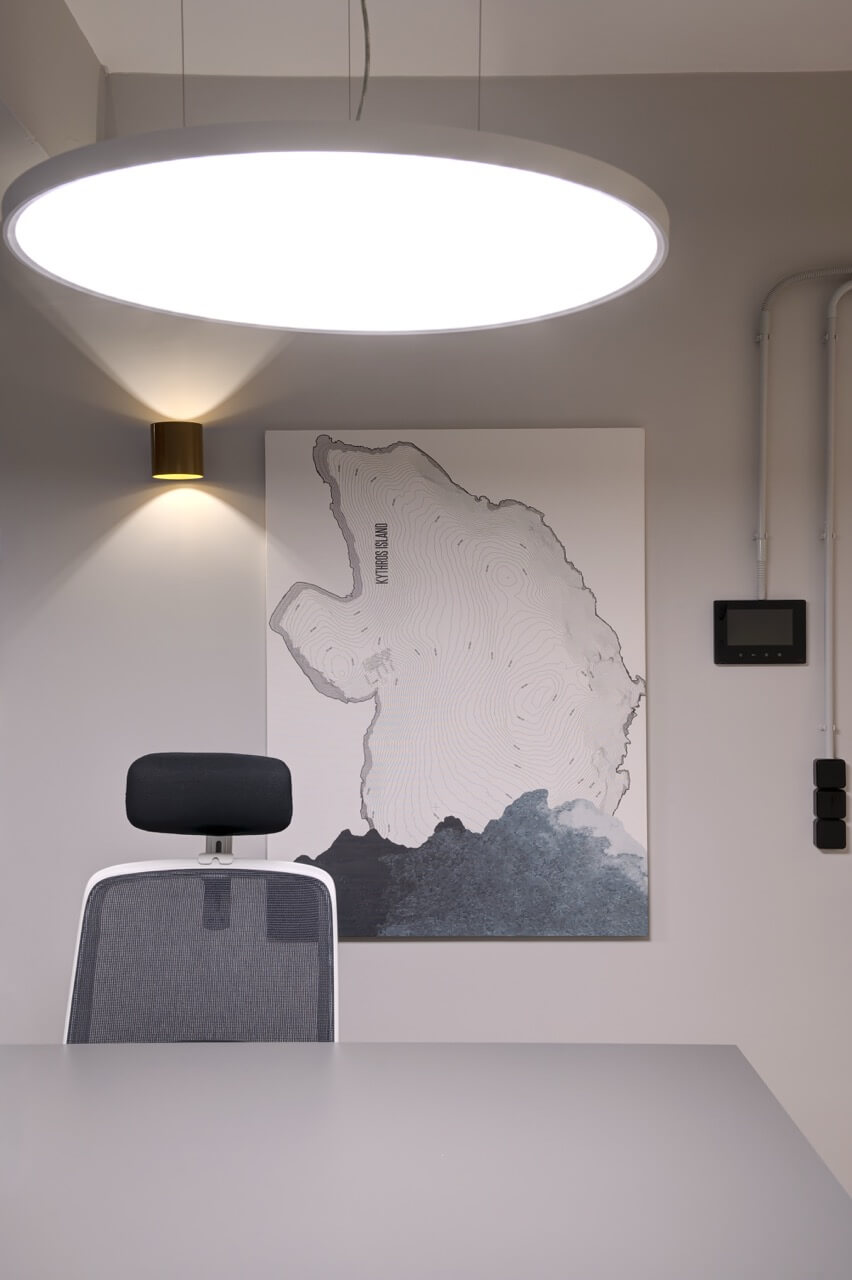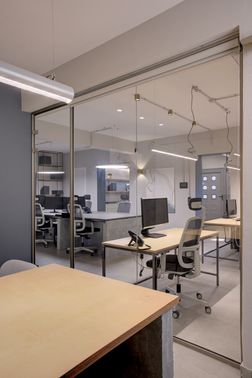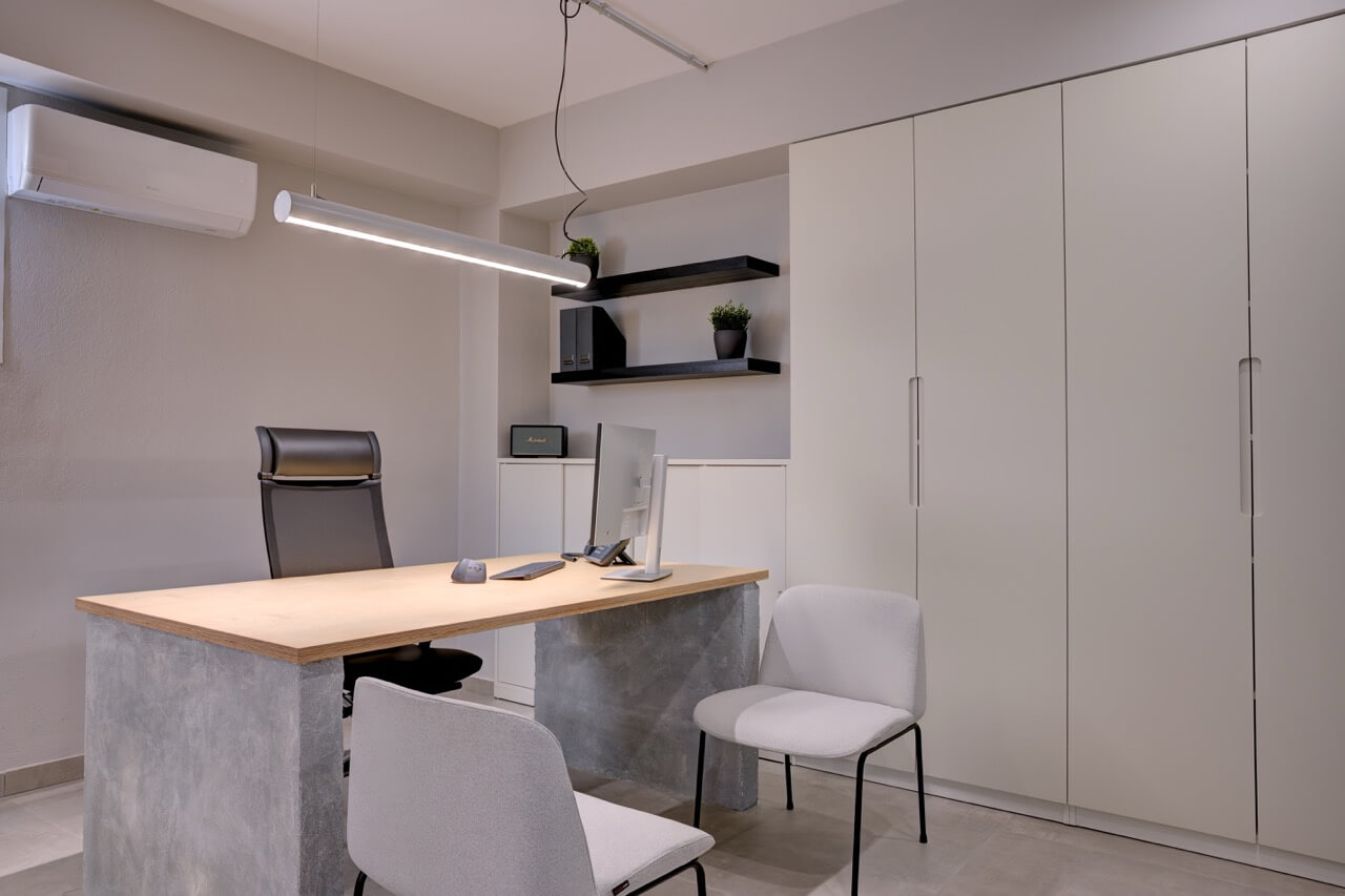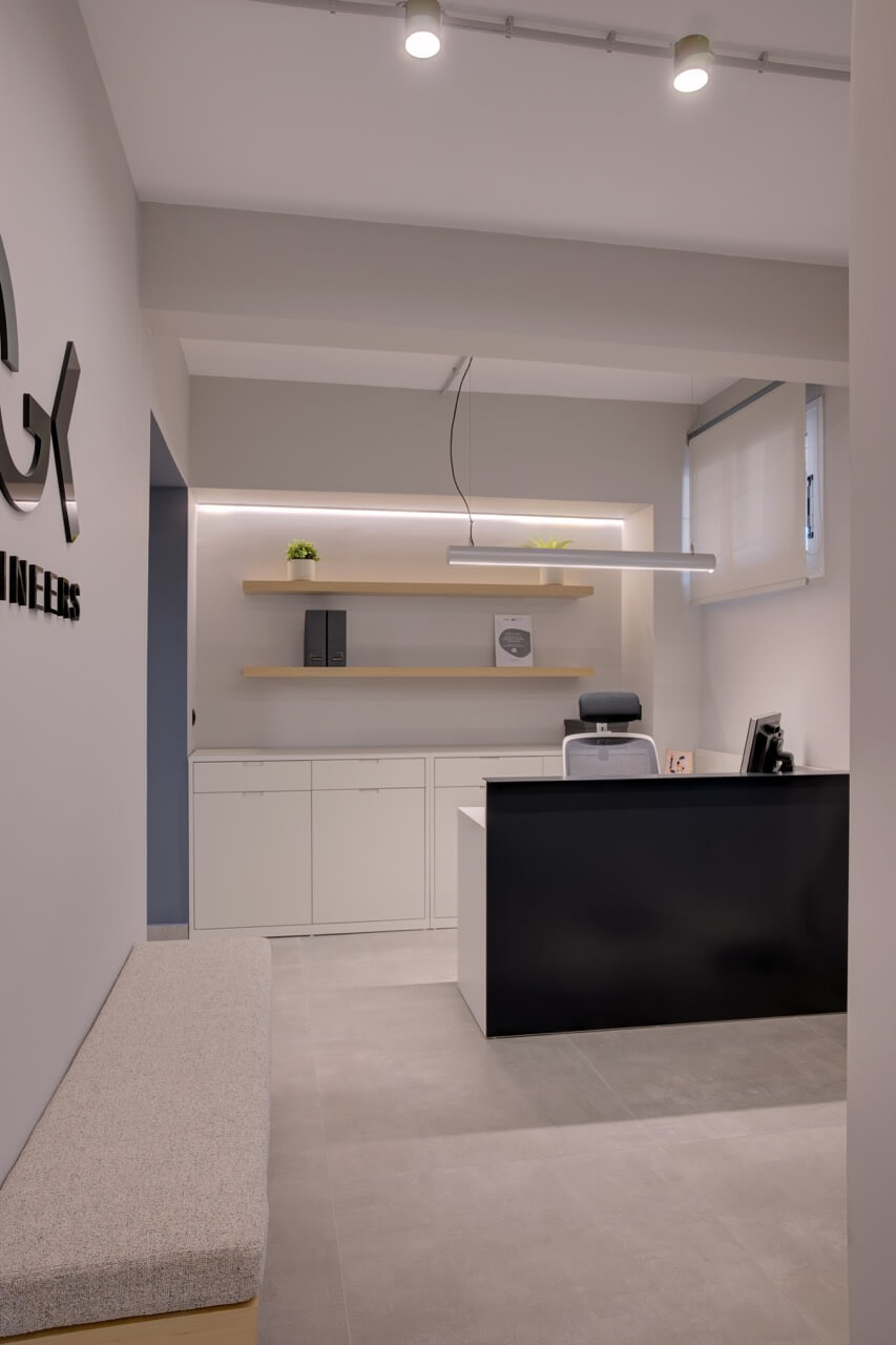 Το τελικό αποτέλεσμα αποδίδει έναν χώρο με καθαρή, minimal αισθητική και ζεστή ατμόσφαιρα, απόλυτα εναρμονισμένη με την ταυτότητα της εταιρείας.
